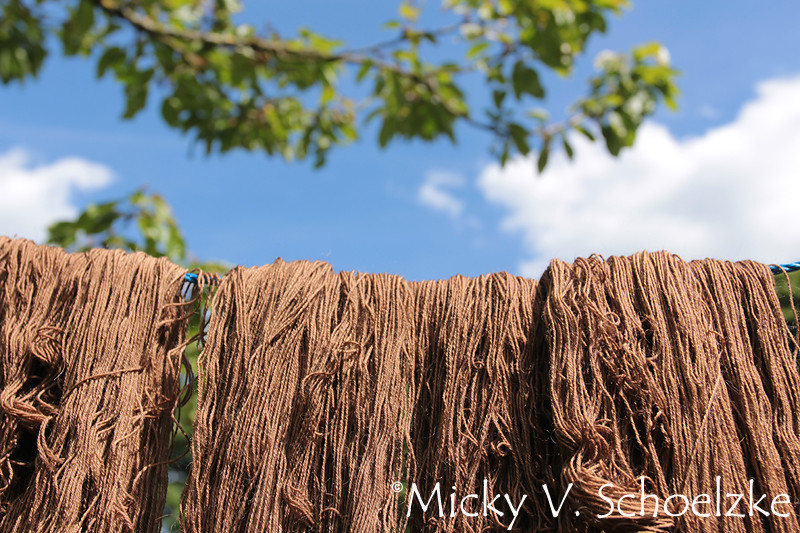 Of course, you can dry fresh walnut husks if you don’t use them all after gathering, but I find that the browns dyed with dried husks are less appealling, maybe because the dryeing process also causes oxidation. There must be some fine chemistry that gets lost… And by the way, the famous Gobelins manufacture also kept walnut husks in casks, covered with water for years to obtain a brown very lightfast dye…