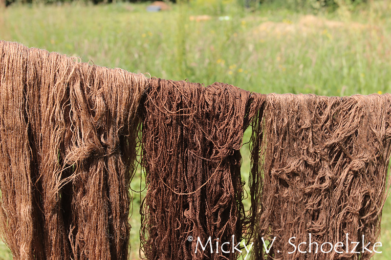 And here’s some thin wool, merino wool (center) and merino-silk drying. The final color will be lighter.
