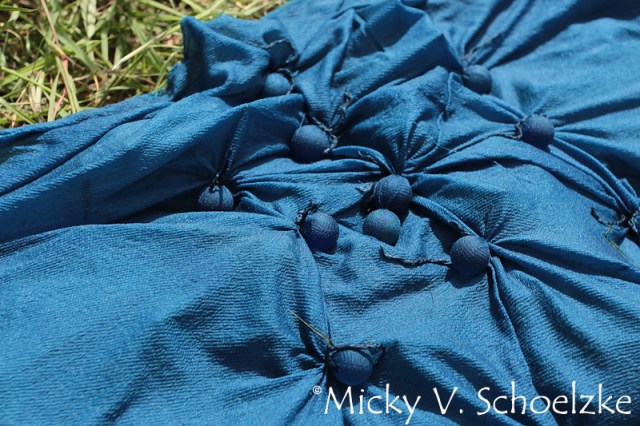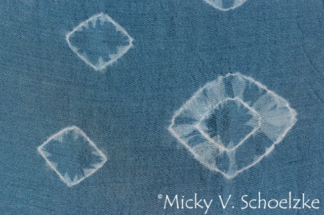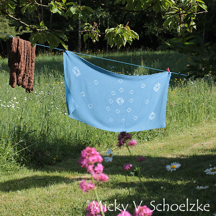Pendant que je surveillais ma cuve de vieilles noix, je me suis amusée avec du tie and dye sur un sympathique tissu laine et soie. J’avais déjà fait un essai d’indigo sur une pièce et je voulais tester comment il se comportait avec cette technique. Et bien c’est sympa je trouve! Il me reste une dernière pièce de ce tissu à teindre, je tâcherais de mieux organiser mes nœuds! 😉