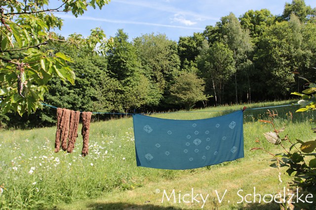 While I was watching my old nut bath, I entertained myself with some tie and dye on a nice wool and silk fabric. I had already tested that fabric with plain indigo dye, but I wanted to test how it would react with tie and dye. Well, it’s rather nice, I think! I still have another piece to dye: I will try to get my ties more organised for the next one! 😉