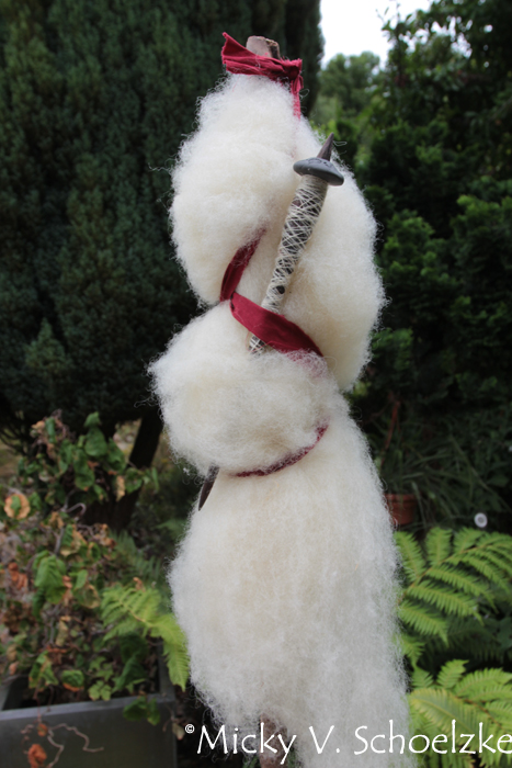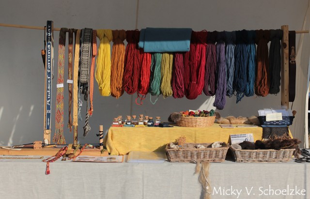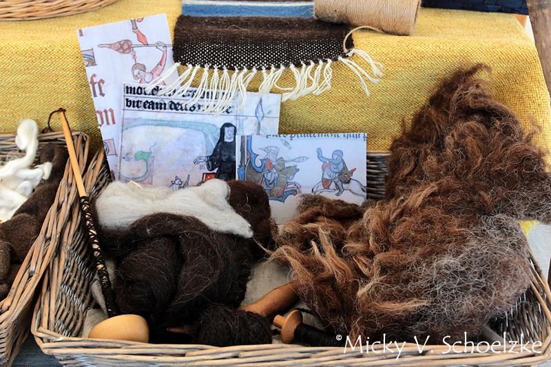 Pas de grandes nouveautés cette année excepté peut-être le fait que depuis que j’ai appris à filer correctement au fuseau, j’ai un peu augmenté cette partie en démonstration. En surveillant mon chaudron de teinture, je m’occupe désormais en filant! A propos chaudron, j’en ai désormais un nouveau en cuivre, qui présente beaucoup mieux que mon chaudron en émail bleu… J’ai également préparé une quenouille, histoire de montrer « l’engin » au public, même si j’ai encore besoin de beaucoup d’entraînement avec cette « troisième main »…