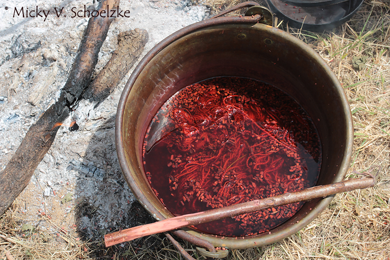 I dyed with birch leaves on saturday and with madder on sunday. And for those who might not believe in the fastness of birch leaves dye, the yellow and the green spend the whole sunday in full sun on display and the color wasn’t altered… This would have lead to some nasty discoloration if I had used onion skins (not very historical dyestuff by the way…), that some still use when doing historical dyeing on camps… Been there and done that in my early dyeing days…