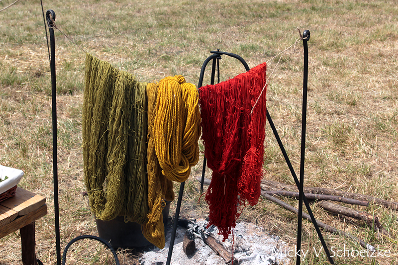 A noter pour ceux qui doutent de résistance de la teinture aux feuilles de bouleau (ahhh, du « petit teint » quelle horreur!): les écheveaux jaunes et verts ont passé le dimanche en plein soleil et n’ont pas bougé… Une teinture (pas vraiment historique soit dit en passant) aux pelures d’oignons que beaucoup s’acharnent à présenter sur des camps n’aurait jamais résisté! J’ai testé à mes débuts… 😉