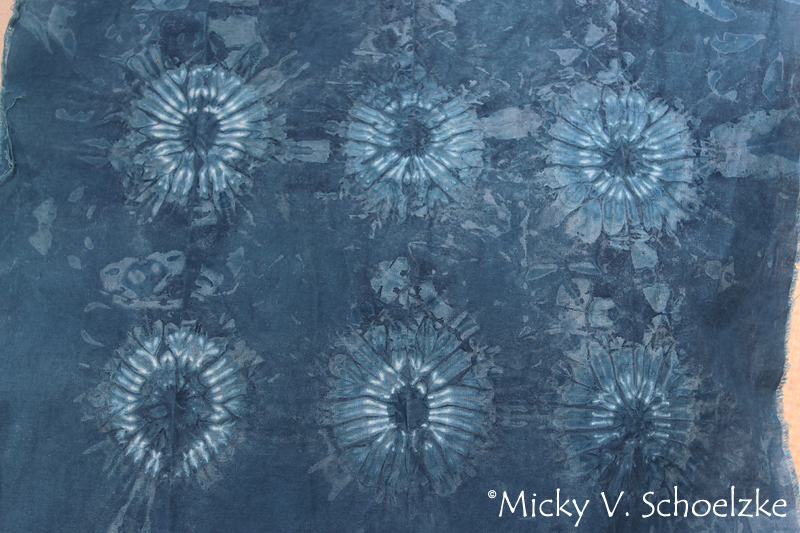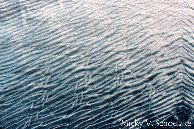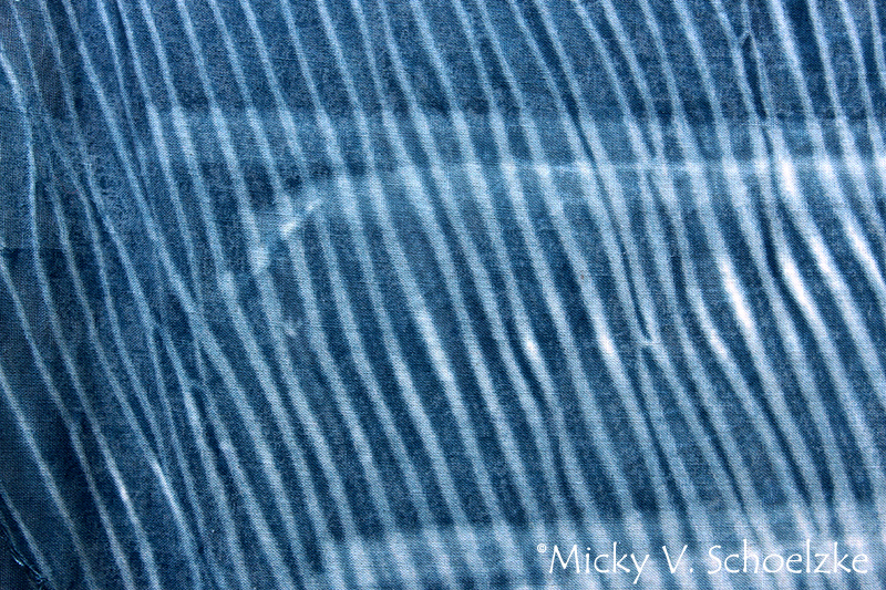 J’ai testé 4 motifs différents sur des pièces d’environ 35cm de large sur 1.5m. Voici les 3 premiers. de gauche à droite: komasu shibori, le « bon vieux » tie and dye » des 70’s et arashi shibori.