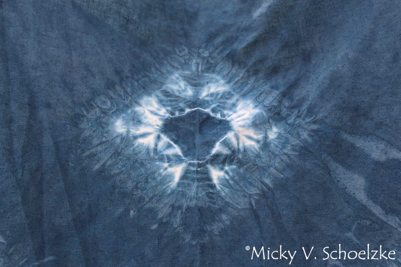 Le karamatsu shibori est beaucoup plus complexe et prend plus de temps! On plie le tissu en plusieurs panneaux et on coud des demi cercles concentriques (3 x 3 motifs de chaque côté de ma pièce pour mon essai). Malheureusement c’est aussi cette technique qui m’a donnée le moins joli résultat! 😦 Je n’ai pas utilisé le bon type de fil ! Tutoriel ici.