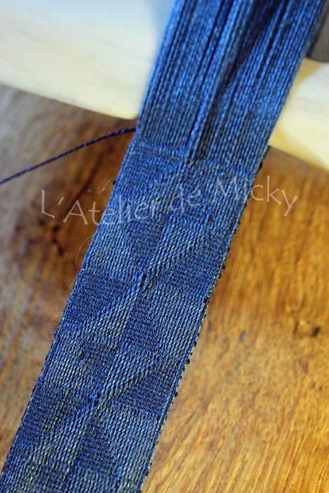 Cerclet en cours de réalisation, en soie fine Nm 60/2 (teinture indigo) pour une commande – Work in progress: a circlet in fine Nm 60/2 silk dyed with indigo, order.