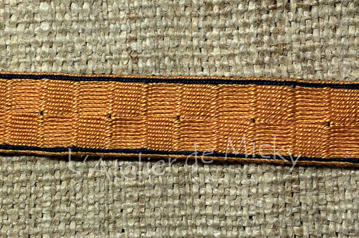 The  finer the silk, the better the « resolution » of the pattern will be. Here are a few test-pieces in fine silk (Nm 60/2), 1.5cm wide.