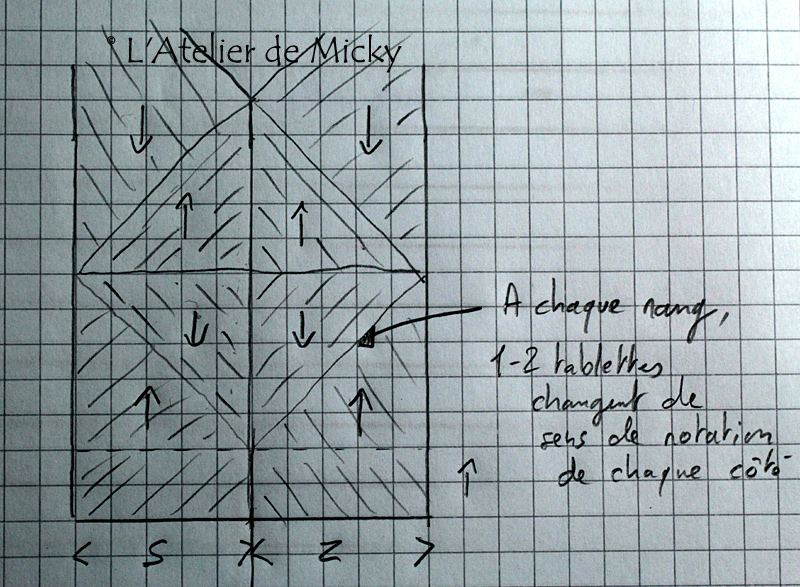 Pour les losanges, toujours très esthétiques, pas de difficulté particulière, si ce n’est que la réalisation va être un peu plus longue. Voici un résumé schématique de ce qui se passe. Si vous avez déjà tissé des « diagonales égyptiennes », vous comprendrez vite le « truc »!