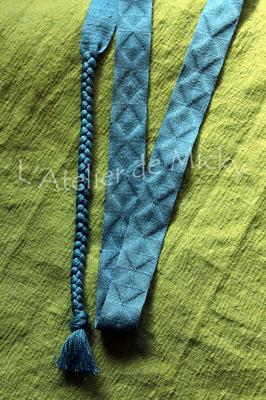 I also finished a 60/2 silk circlet with a nice lozenge structure. The silk is dyed with indigo, of course! The fabric underneath is the green overdyed wool, I couldn’t manage to get two identical pictures to show you its « real » colour!