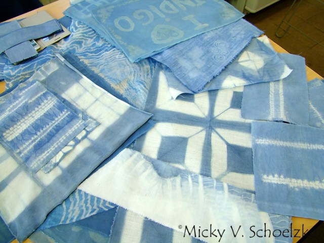 J’ai pu  regarder, toucher et flairer une cuve organique (à base de chaux et de fructose) en action, expérience très intéressante qui va me permettre d’améliorer mes procédés de teinture et les adapter aux matières que je teinte régulièrement. Après des années de cuves à l’hydrosulfite, on doit totalement remettre à plat sa façon de faire avec les cuves organiques qui n’ont pas le même aspect, pas la même odeur, pas le même pH etc. mais c’est très excitant! Nous avons également fait un peu de shibori et utilisé deux pâtes de réserve pour des motifs (à base d’argile et de gomme arabique pour l’une et de farine de riz gluant pour l’autre). Voici quelques images!