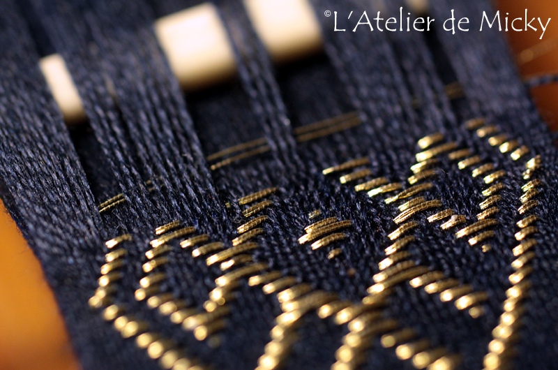 Même si les teintures m’ont bien occupée, j’ai pris du temps pour démarrer un test en tissage aux tablettes, inspirée de la ceinture de Philippe de Souabe. J’ai dessiné les diagrammes et fait quelques essais, voici une jolie photo de très près du fil d’or utilisé pour le broché. Encore pas mal de travail sur ça avant de démarrer le vrai projet…