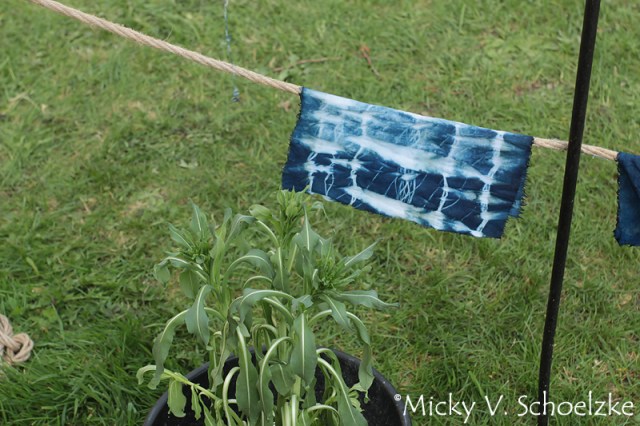 Un week-end bien sympathique entourée d’artistes et d’artisans dans un cadre superbe et sous le soleil s’il vous plait! Pour l’occasion, j’avais préparé une cuve d’indigo au sulfate de fer, qui permet d’obtenir de beaux bleus profonds sur fibre végétale. Les participants aux mini-ateliers ont pu s’amuser au shibori tout en en apprenant davantage sur les teintures en bleu.