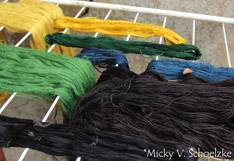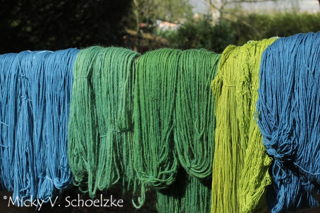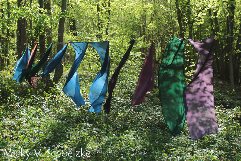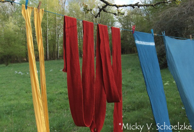 On some days, there were many different things dryeing in the garden! Silk dyed with buckthorn alder, madder red legwraps and some indigo-dyed cottons.