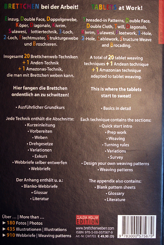 Je me suis offert un cadeau de Noël! A moi et à la bibliothèque de l’Atelier de Micky… Le nouveau livre de Claudia Wollny, « Tablets at work » en édition bilingue allemand/anglais. Je dois dire que j’ai été épatée par le contenu, même si je n’ai pas encore eu le temps de tout lire. Un livre comme j’aurais aimé avoir à mes débuts, à la fois très complet mais qui reste accessible et qui couvre pratiquement tous les aspects du tissage aux tablettes! J’ai particulièrement apprécié l’approche très « logique » que ce livre propose et que je m’efforce moi-même de transmettre lors des stages que j’organise… Claudia Wollny a fait un travail absolument remarquable et je ne peux que recommander ce livre. Vous pouvez l’acheter, lui et d’autres livres, ici sur le site de l’auteur: https://www.brettchenweben.com/shop/