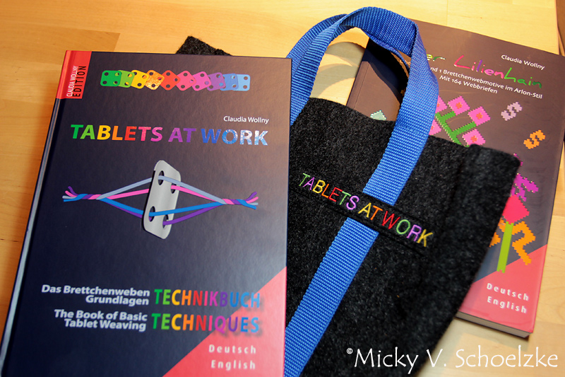 Je me suis offert un cadeau de Noël! A moi et à la bibliothèque de l’Atelier de Micky… Le nouveau livre de Claudia Wollny, « Tablets at work » en édition bilingue allemand/anglais. Je dois dire que j’ai été épatée par le contenu, même si je n’ai pas encore eu le temps de tout lire. Un livre comme j’aurais aimé avoir à mes débuts, à la fois très complet mais qui reste accessible et qui couvre pratiquement tous les aspects du tissage aux tablettes! J’ai particulièrement apprécié l’approche très « logique » que ce livre propose et que je m’efforce moi-même de transmettre lors des stages que j’organise… Claudia Wollny a fait un travail absolument remarquable et je ne peux que recommander ce livre. Vous pouvez l’acheter, lui et d’autres livres, ici sur le site de l’auteur: https://www.brettchenweben.com/shop/