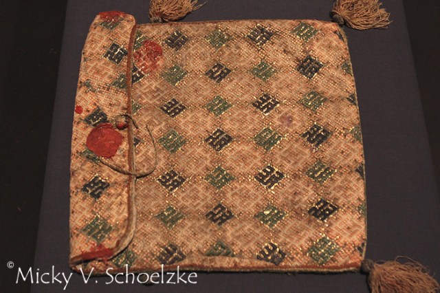 Another example of silk use in embroidery: a pouch I photographed last fall in the Schnütgen museum in Köln. It’s XIVth century. For this kind of embroidery, tram or filament silk is probably often used.