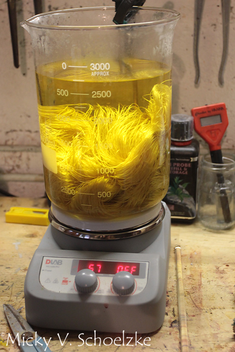 This silk is very delicate… I first have to wind it into small skeins, generally 200 or 400m in length, then dyeing it in small vessel (I like to use glass beakers for that, so I can keep an eye on it when I have to stir the bath!). It’s very slippery and has a tendency to get tangled, which you can avoid by a careful way of winding and a lot of gentleness during all the stages of the process! Something to put your patience to the test believe me! But I like working with that silk, it’s like a meditation in a way, you have to be « high in, low out », a lot of concentration coupled with gentleness to avoid any false movements or wanting to go too fast!
