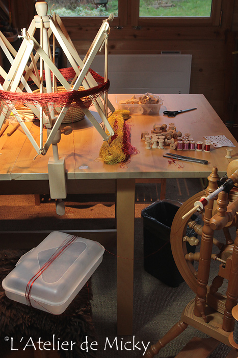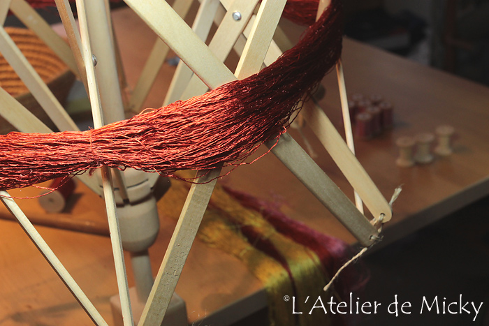 Une fois la soie teintée, commence le travail assez fastidieux de mise en bobines… Comme je n’ai pas de canetière, je me sers de mon rouet, ce qui marche très bien! J’ai trouvé l’autre jour un tout petit écheveaudoir, qui me permet donc de facilement travailler mes petits écheveaux pour mes petites bobines… Je me sens comme dans une maison de poupée! 🙂