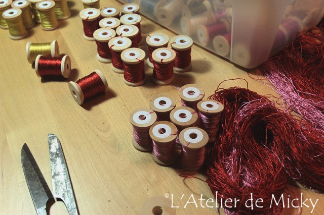 Once the silk is dyed, the tedious work of winding it onto wooden spools starts… As I don’t have a bobbin winder, my castle spinning wheel serves as a substitute and it works like a charm! I alos found a very small skein winder the other day, which is great for my little skeins to be wound onto my little spools… I feel like in a doll house! 🙂