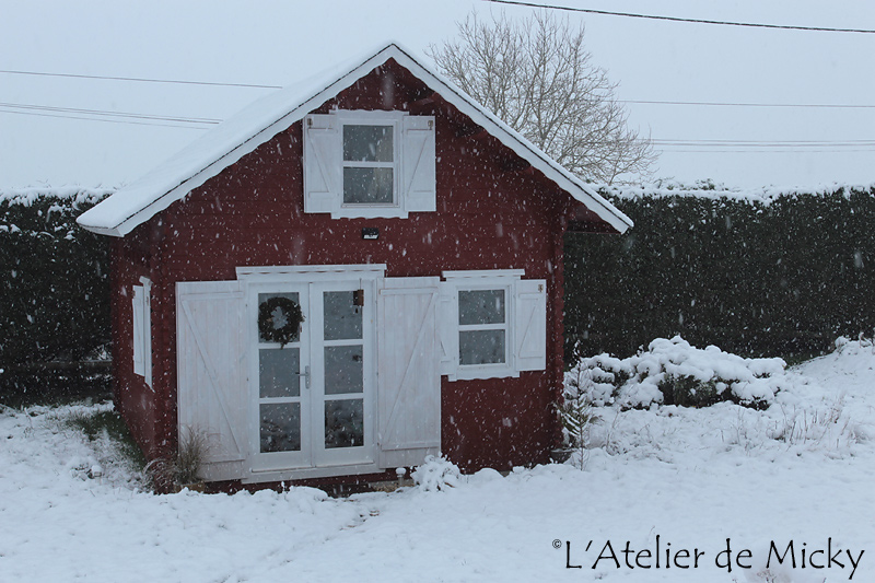 C’est assez rare chez nous pour mériter un article et quelques photos…La neige va bien à mon atelier et c’est tellement confortable d’y travailler en regardant la douceur blanche et les oiseaux qui viennent chercher des graines.