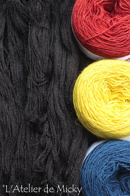 Ci-dessus, vous avez le résultat du premier teste réussi sur laine fine en écheveau: la laine a été mordancée, puis passée dans un bain de garance concentré et un bain de gaude concentrée. Ensuite, beaucoup de bains d’indigo ont été réalisés pour enfin arriver jusqu’au noir… Au Moyen-Age, on teintait en rouge sur du bleu le plus souvent, pourquoi avoir fait le contraire, me direz-vous? Parce que tout simplement, j’avais besoin de voir comment le bleu agissait, à quelle(s) concentration(s) et au bout de combien de bains, pour mieux comprendre cette triple couleur.