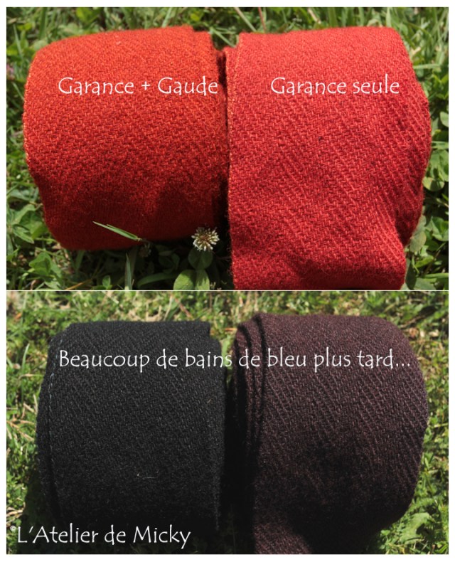 I was wondering how the weld yellow affected final results, so I did some testing on woolen legwraps (less efforts than big pieces of fabric!) With the same amount of blue dips, I reached the « true » black more rapidly than with madder alons, but as you will see in Black with plant dyes, part 2, it is clearly possible.