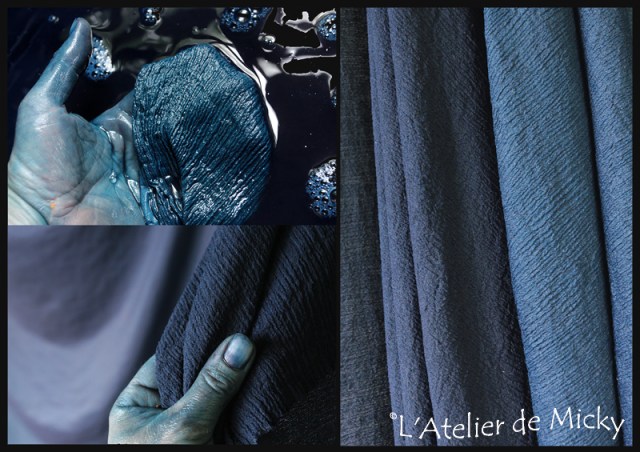 Avec le retour de températures plus chaudes, j’ai réactivé ma grosse cuve d’indigo à base de garance et de son, préparée l’été dernier. J’ai quelques grandes écharpes en coton froissé à teinter et puis de nouveaux tests à faire, notamment sur de la soie! Voici quelques images.