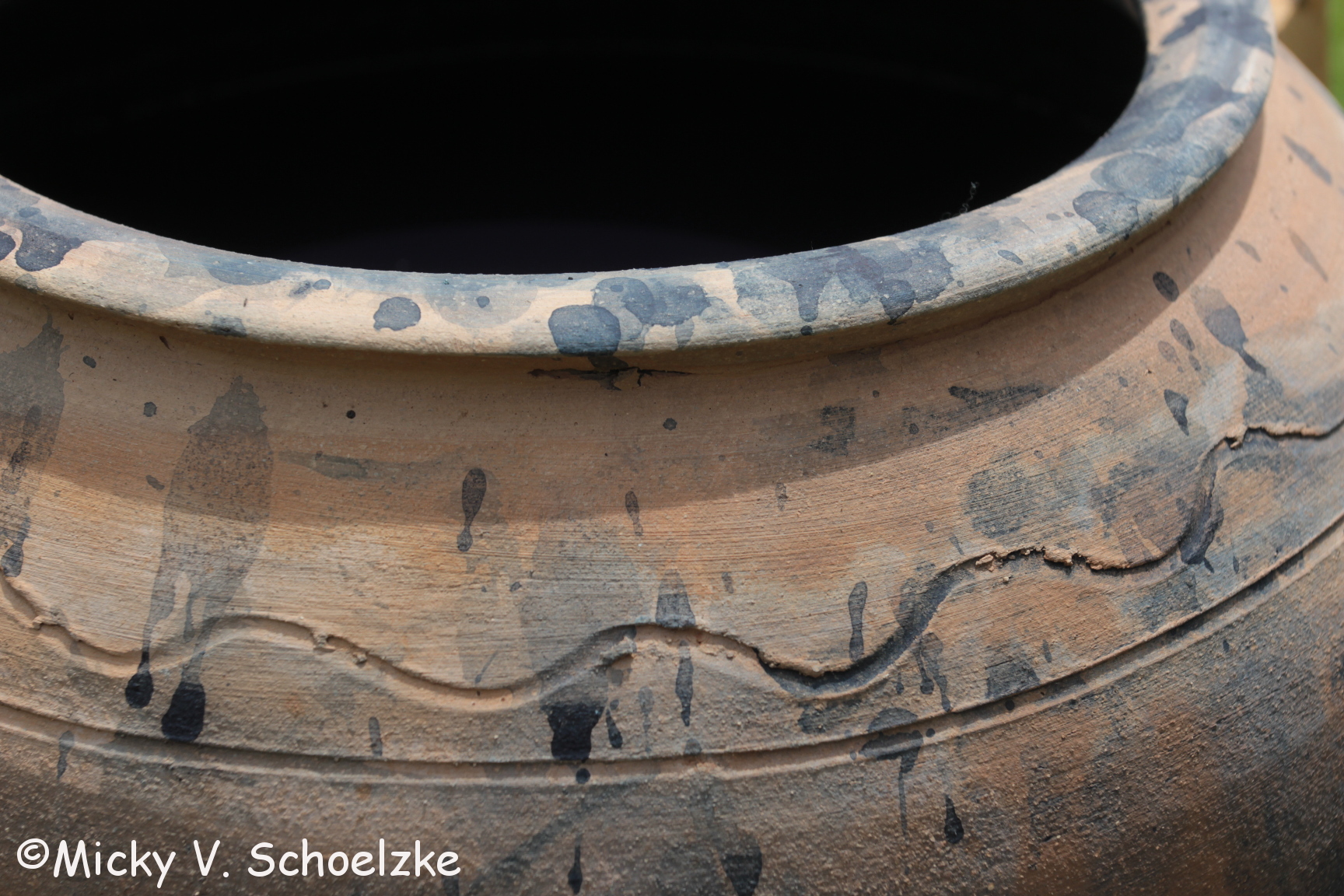 Cette fois-ci, c’était pour les rencontres mérovingiennes en petit comité et donc avec moins de pression que pendant un gros festival. J’en ai profité pour baptiser mon dolium, que je destine à des expérimentations tournant autour de cuves de bleu (à suivre… c’est juste le début!) Le dolium a été réalisé sur commande par l’archéo-céramiste suisse Pierre-Alain Capt en 2016, j’ai choisi cette forme pour avoir une ouverture plus réduite en haut (moins de surface d’oxydation) en conservant un volume intéressant à l’usage. Le mien fait une grosse trentaine de litres. Pour en savoir plus sur la fabrication, vous pouvez consulter la page de Pierre-Alain.