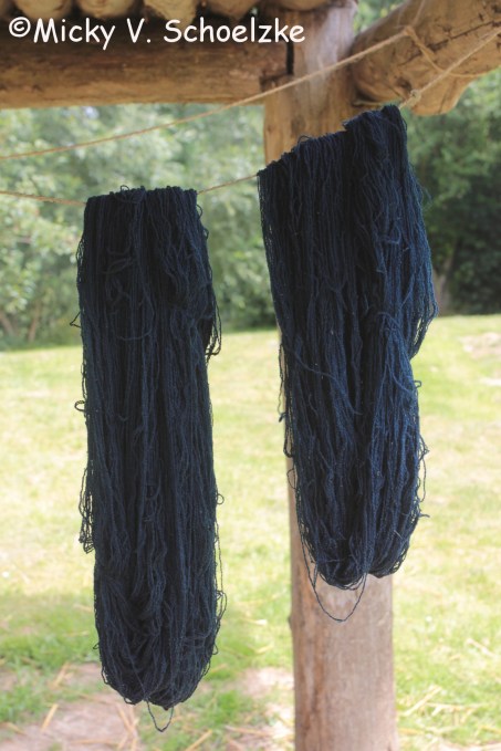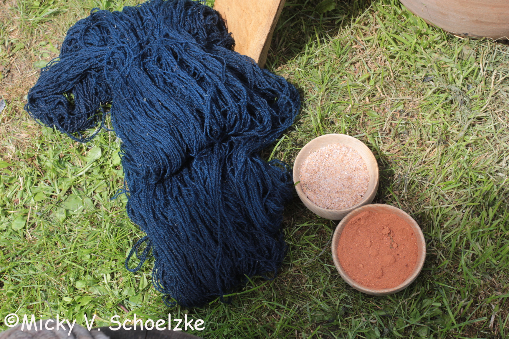 The indigo vat is about a year old and has been in use at home, it’s based on pottash, madder and bran. It was transported in a airtight plastic bin then carefully poured into the dolium, placed near a fire. Everything went fine, the ideal dyeing temperature was reached quite easily and doesn’t get too low at night (the nights were rather chilly!). After this first try, I’m looking forward to a longer and more documented experimentation, but it was such a pleasure to use it at last!