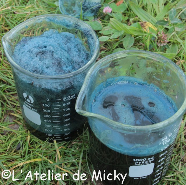 Today, I worked in the dye plant space of my garden and I pulled up some of this year’s woad plants in order to prepare the soil for next year’s seeds. I gathered 1 kilogram of small leaves in total, bu the extraction was a success with quite a lot of pigment deposited and a foam so beautiful than I could roll around in it with bliss! Yeah, I’m peculiar… but look at that blue!!
