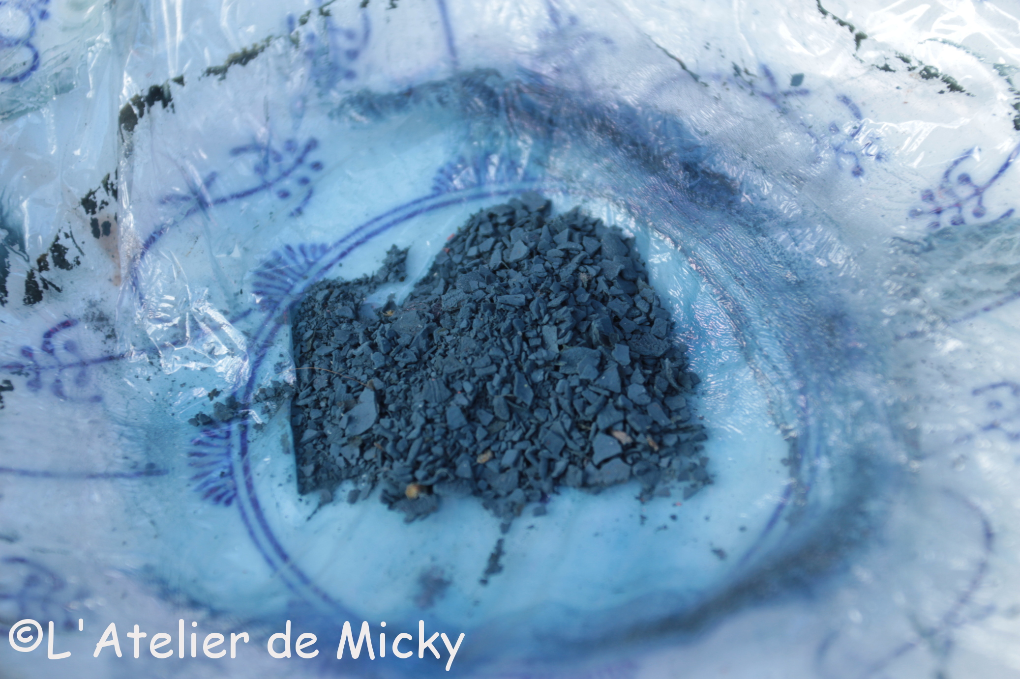 J’ai eu l’occasion de m’en rendre vraiment compte en faisant une formation aux cuves de bleu pour les animateurs d’un archéosite début septembre: j’avais ramené 700g de feuilles pour leur montrer comment faire une extraction et le résultat a été de 3g de pigment pur, ce qui est plus que d’habitude pour moi! Généralement, j’obtiens quelque chose comme 2g par kilo de feuilles fraîches.