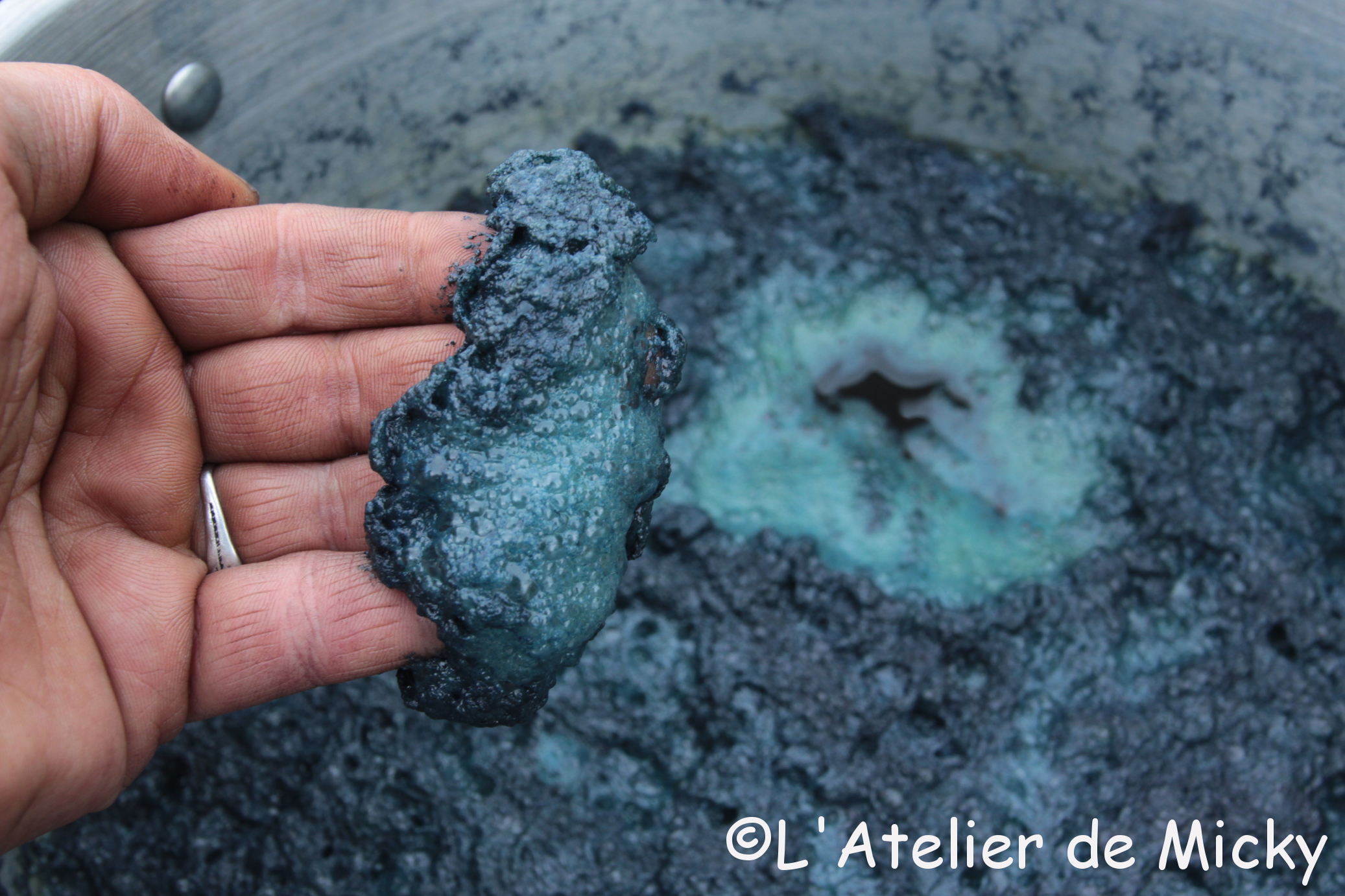 Aujourd’hui, j’ai mis un peu d’ordre dans mon espace tinctorial au jardin et j’ai arraché quelques pieds de pastel de cette année afin de pouvoir préparer le sol pour les semis de l’année prochaine. En tout, j’ai récolté un kilo de feuilles, toutes petites. Mais l’extraction a été un succès, beaucoup de pigment déposé et une mousse si belle qu’on se roulerait volontiers dedans avec bonheur! Oui, je suis spéciale… mais regardez-moi ce bleu!!