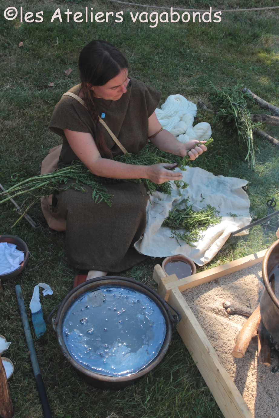 Vous trouverez le reportage photo de l’édition des journées mérovingiennes de juin ici. En aout, mon beau dolium (baptisé Lucius parce qu’il est né dans un four romain…) a de nouveau teinté à Marle, du fil de chanvre et de lin cette fois!