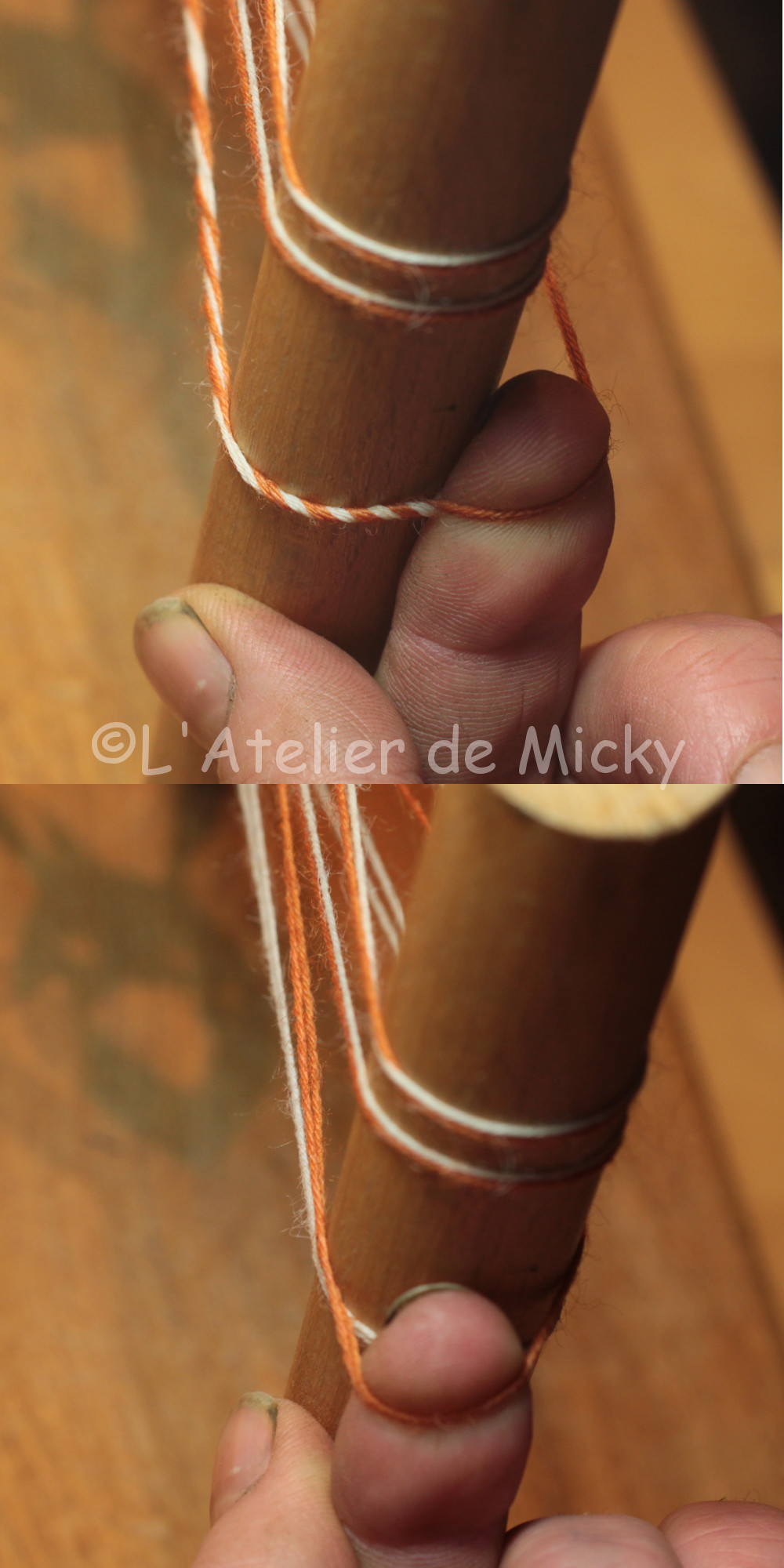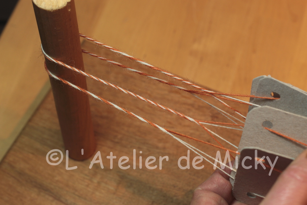 C’est l’un de ces motifs où l’on tourne toujours les tablettes dans le même sens, créant ainsi une accumulation de torsion au niveau des cordes de la chaîne. La pièce originale fait moins de 20cm, on ne sait donc pas si des changements de sens étaient intégrés ou non…On me pose souvent la question de savoir comment remédier à ce problème, j’en profite pour essayer d’apporter quelques pistes! Vous pouvez fixer à chacune des cordes (donc ici 12 au total) des pesons si votre chaîne est « libre » (sur un métier vertical par exemple ou bien sur un système proche de celui-ci). Vous pouvez aussi utiliser des émerillons de pêche y compris si votre chaîne est fixée par exemple sur un métier de type inkle loom.