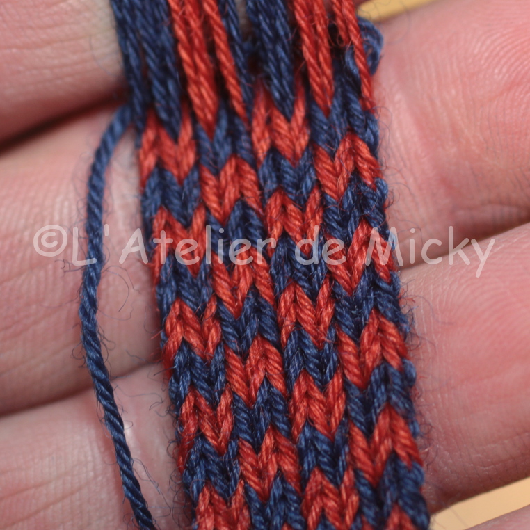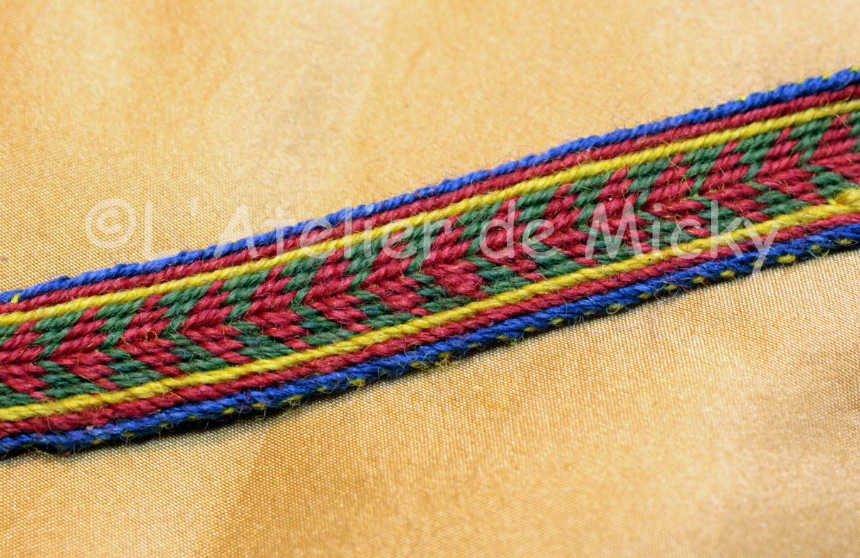 Voici le galon « vite fait » en laine 14/2 teintée rouge garance, bleu indigo, jaune gaude et vert gaude + indigo. Il est un peu plus large que l’original (14mm au lieu de 11mm).