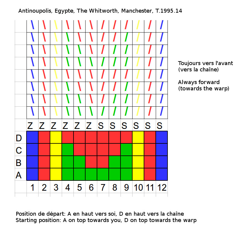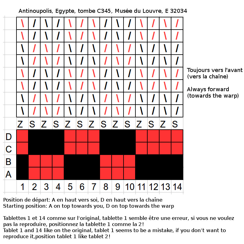 I have an image of this band, but you will have to believe me about the interpretation of the pattern, because I don’t have publication rights for the photo and I didn’t find it online! (if you happen to find it, please let me know!) It’s a band from tomb C345, kept at the Louvre Museum. The colors appear to be red and black (or very dark anyway) and you can clearly see the direction of the threads in the weaving.