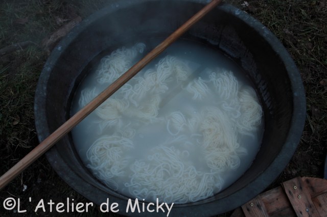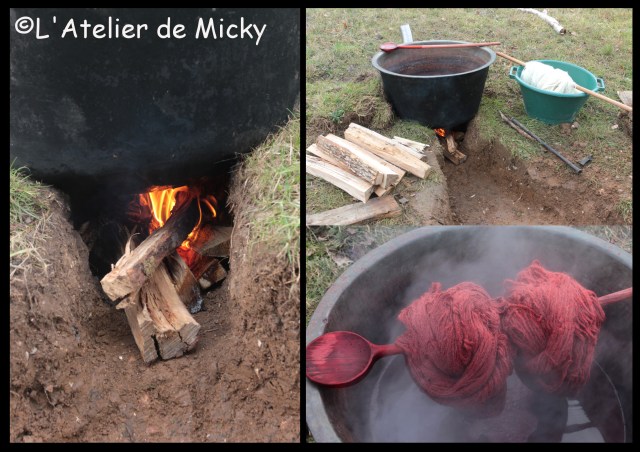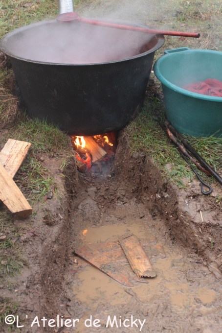 I love dyeing on an open fire… It’s more difficult, because you have to monitor your fire carefully, especially if you dye with stuff requiring temperature control like madder. With gas you just turn down the heat when needed, with fire you have to anticipate. But fire speaks a langage of its own, crackling, roaring, hissing or sighing, telling you what it needs. Leaning over the big dyeing pot, with smoke and steam in my eyes and nostrils, I listen to the fire and to the sounds the pot is making. I also smell the dyestuff, feel the temperature slowly rising with my hands. I’m well aware of everything happening, all my senses are occupied. In these moments, I feel very connected to the dyers of old times. Did their eyes sting the same in the smoke? Did their backs and arms ache the same after some time turning the wool over and over in the pot?