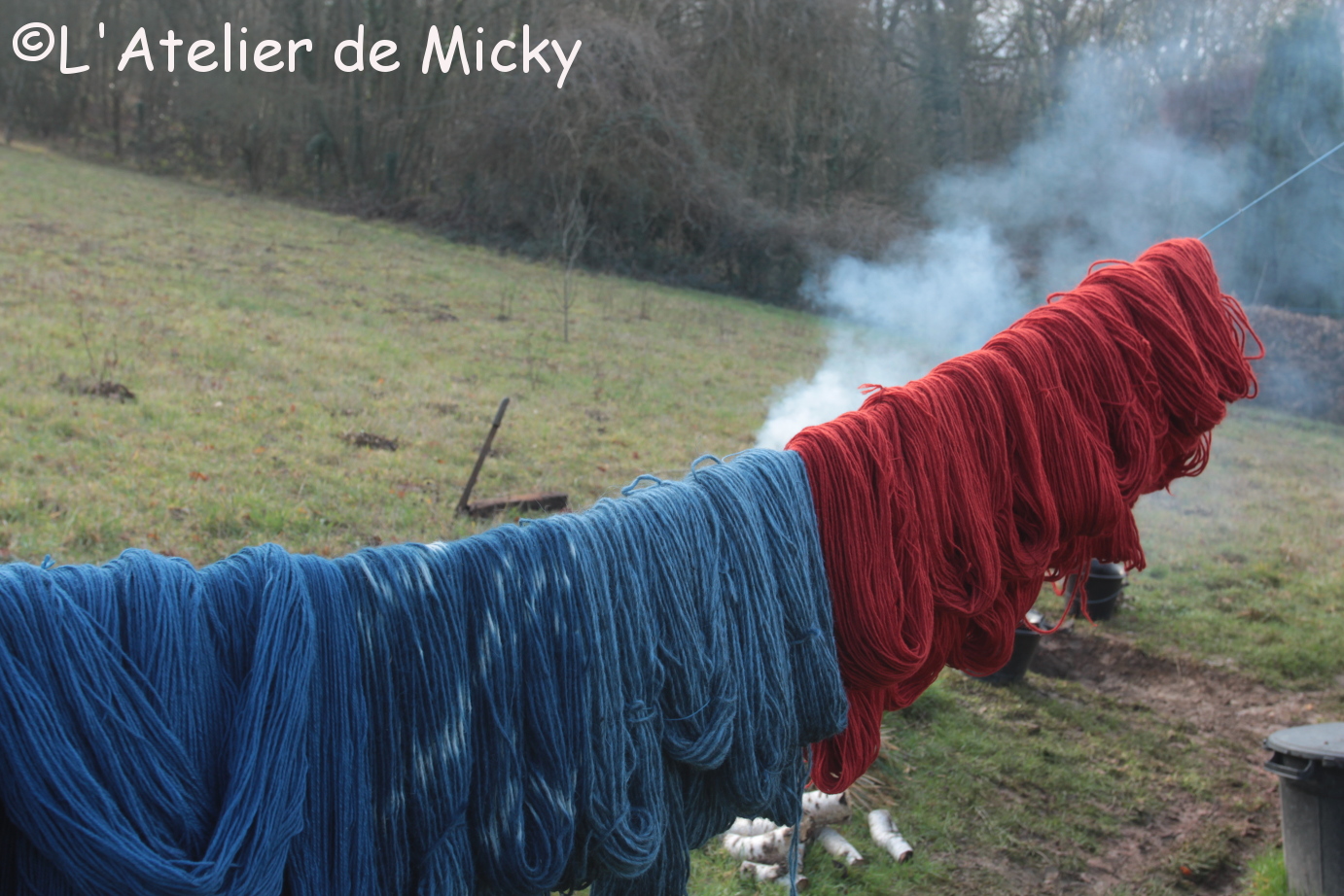A la cave, j’ai mon espace de teinture à l’indigo, je préfère teinter les bleus au chaud! Mais il m’y manque la Nature autour de moi, regarder passer les oiseaux ou l’occasionnel chevreuil! Parfois, le temps permet de mettre les écheveaux à sécher dehors.