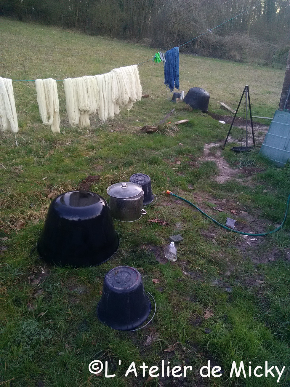 Du côté des teintures, je viens de terminer le grand nettoyage de printemps et ressorti toutes mes cuves dans mon espace extérieur. Il y a toujours un petit risque de gel évidemment, mais je peux me resservir des robinets et cuves d’eau de pluie!