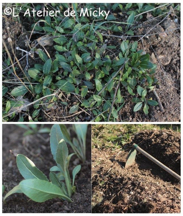 D’abord il y a le jardin et en-dehors des travaux au potager et au jardin d’agrément, il me faut m’occuper de mon Pastel. J’ai eu une très belle production de graines l’an dernier et comme d’habitude, j’en laisse une partie se ressemer naturellement, je trouve que les plants issus de semis naturels d’automne sont beaucoup plus résistants et productifs que ce que je peux semer moi-même au printemps. J’éclaircis ces plants et je transplante certains en terre sur buttes préalablement enrichies de compost et de déchets de toisons de moutons.