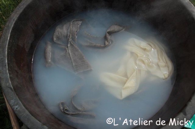 Et pendant que j’y suis, je m’attaque aussi au mordançage de quelques tissus. Voici 2x3m de laine diamant tissé main, et ce n’est pas fini… J’ai encore de longues heures à passer devant mon grand chaudron! J’essaie d’en faire le maximum avant que ma saison d’évènements d’animation ne démarre en juin.