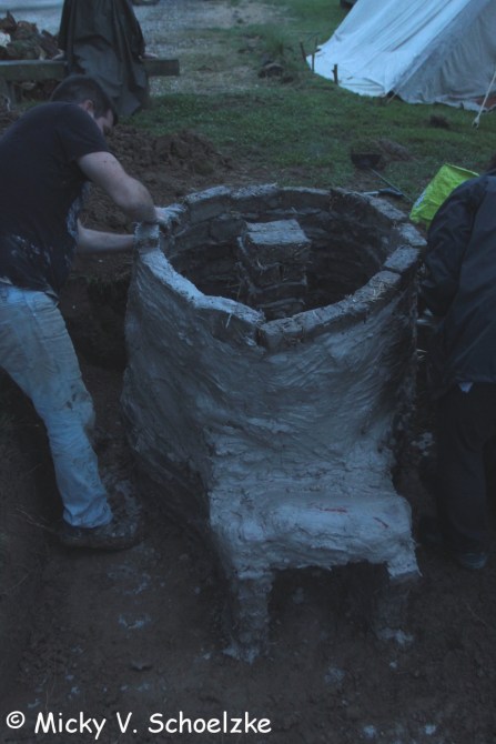 Upon arrival on friday night, first thing I did was constructing my fireplaces  to keep my indigo vat warm, I didn’t want to have the same problem as the week before. I soon discovered that the provided wood wouldn’t heat up well. With the dyes I had planned, this issue became a bit of a stress factor! To heat up a large volume of water efficiently, you need wood that burns well and creates some embers, which wasn’t the case… In the meantime, my neighbors were building a pottery kiln! The quality of the wood was to become a problem for them too!