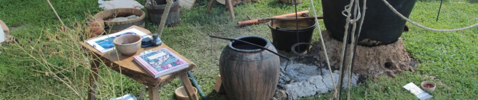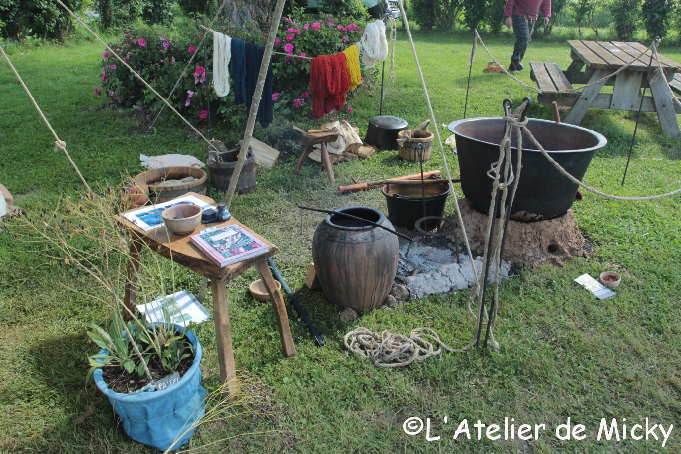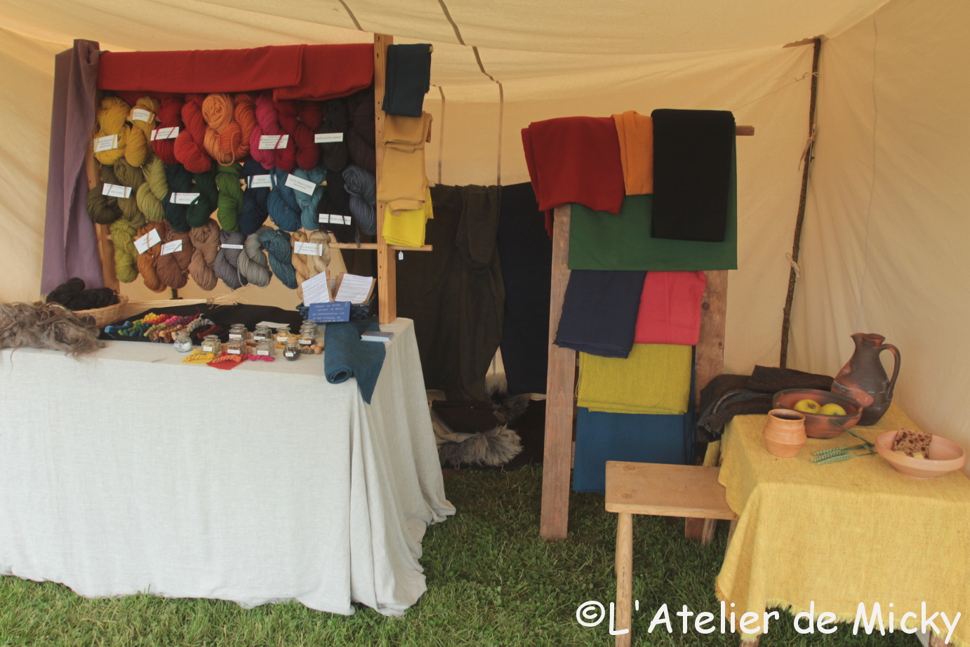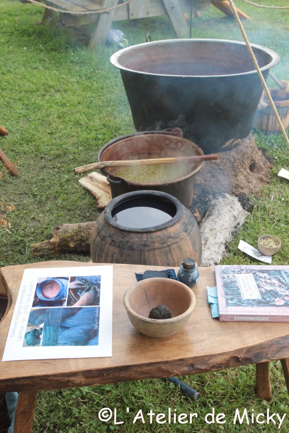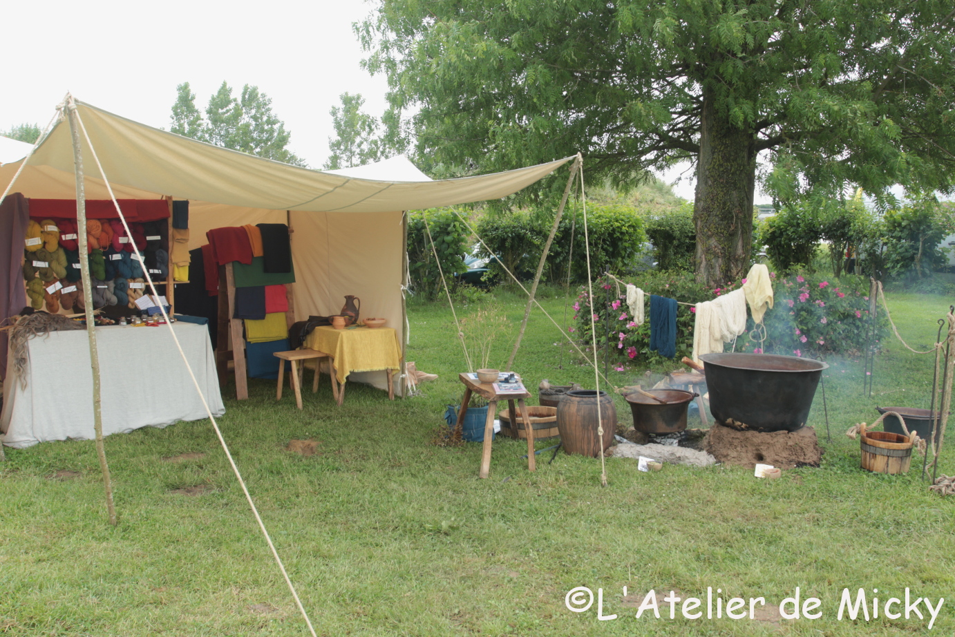 Ma présentation était composée d’une tente avec des exemples de teintures végétales et d’une partie foyer de teinture, avec un foyer fermé pour le grand chaudron (base pour le chaudron en briques recouvertes de torchis) et un foyer ouvert plus petit pour le petit chaudron et le maintien au chaud du dolium à bleu.