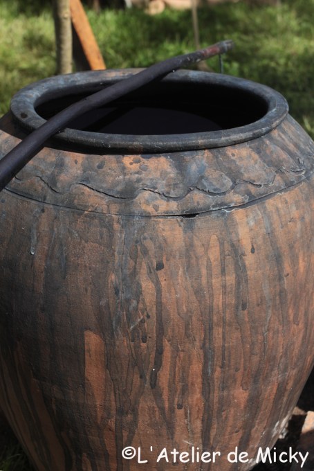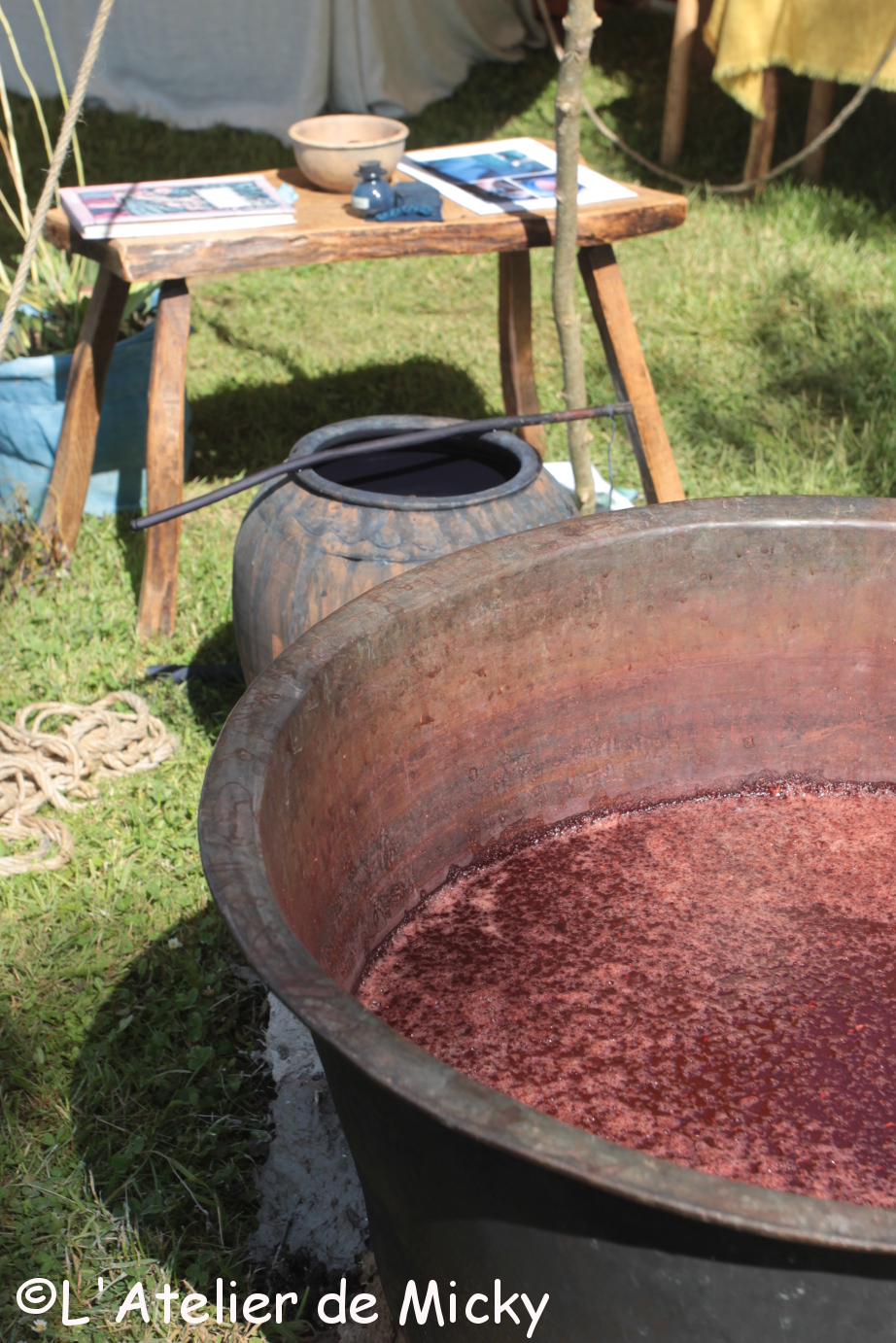 La cuve d’indigo dans le dolium allait bien et j’ai pu montrer l’oxydation de l’indigo aux visiteurs sans problème. Beaucoup plus de visiteurs que prévu d’ailleurs!