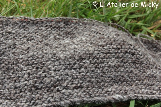 J’avance aussi (lentement!) sur un nouveau snood tricoté en laine de mouton Jacob, filée au rouet également en un seul brin. Je suis étonnée par la douceur de cette laine!