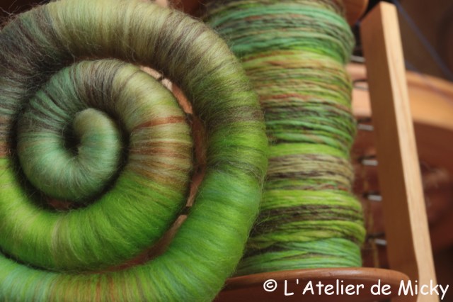 Well, here’s a craft that can be very meditative: spinning! I’m not a really good spinner, but I love spinning and I received, as a Christmas gift, some gorgeous rolags from Fellview Fibres, an english crafter who creates little gems! I started with the « Bursting buds » mix: merino, Shetland and tussah silk, spinning on « Egon », my spinning wheel, sitting alone and abandoned in a corner for too long…