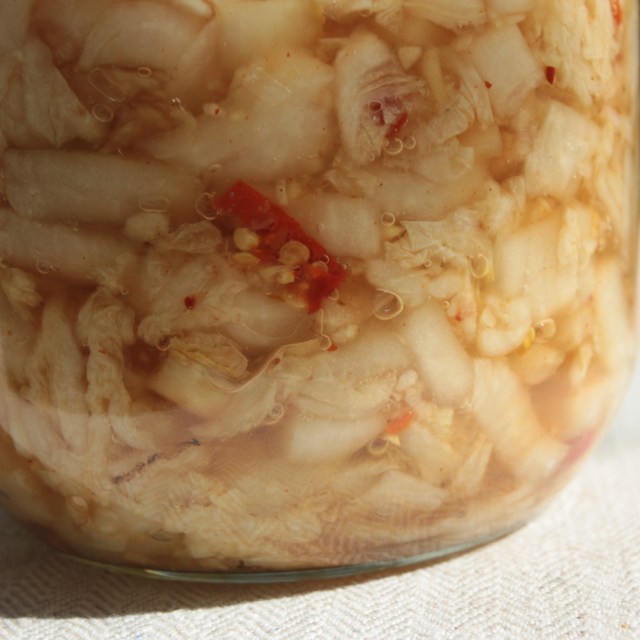 And because I haven’t written here for some time, I will add something to this article! In these days of lockdown, when we don’t shop often, fermented vegetables might be worth a try!  To spice up my food, which doesn’t really need it because I’m a chili pepper addict, I made some kim chi again. It’s fermented Korean cabbage (well cabbage or other vegetables actually). My recipe is simplified but works well, I keep it in the fridge or a cool place for weeks, the taste is evolving but that is what’s great with lacto-fermentation; your nose is telling you right away if the produce is edible or not!