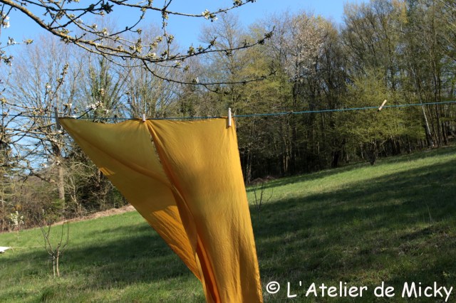 Comme mon stock de matières tinctoriales commence à diminuer, j’ai décidé de me garder les grosses quantités à teindre pour plus tard et de commencer par les choses légères et délicates, comme la soie. Je viens de mordancer une grande quantité d’écharpes et de foulards et j’ai commencé avec une jolie teinture orange (gaude sur une base de garance clair).