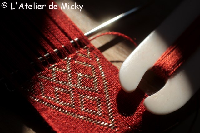 J’ai également repris ma ceinture brochée, que je dois terminer avant l’été. C’est beau à regarder, quand le soleil vient caresser la soie rouge et le fil doré en fin de journée par la fenêtre de l’atelier.