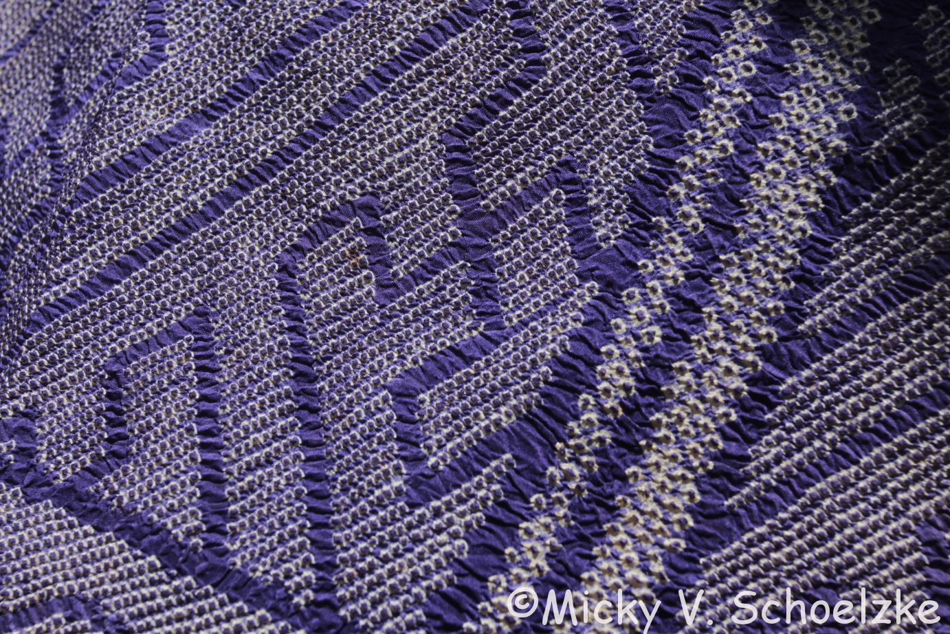 And here’s an obi (kimono belt) in Chirimen silk (dye unknown, probably synthethic), with a sayagata pattern.